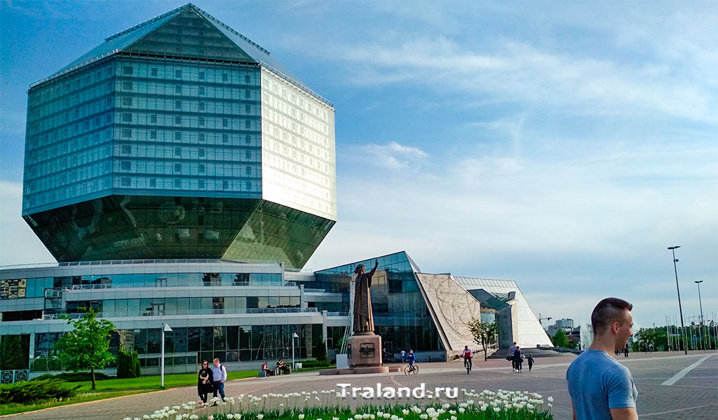 Высота 23-этажной крупнейшей библиотеки республики — 74 м, площадь — 113 тыс. кв. м. Каждый день строение подсвечивается медиаэкраном: с наступлением сумерек и до полуночи. При библиотеке открыты музей, галерея, кафе. У входа стоит памятник Франциску Скорине — белорусскому первопечатнику.