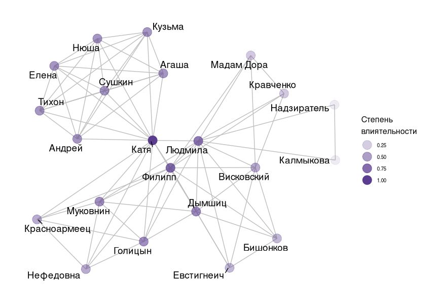 Степень влиятельности показывает важность персонажа, учитывая влиятельность персонажей, с которыми взаимодействует данный персонаж. В пьесах эта метрика позволяет разделить действующих лиц на «центральных» и «периферийных»