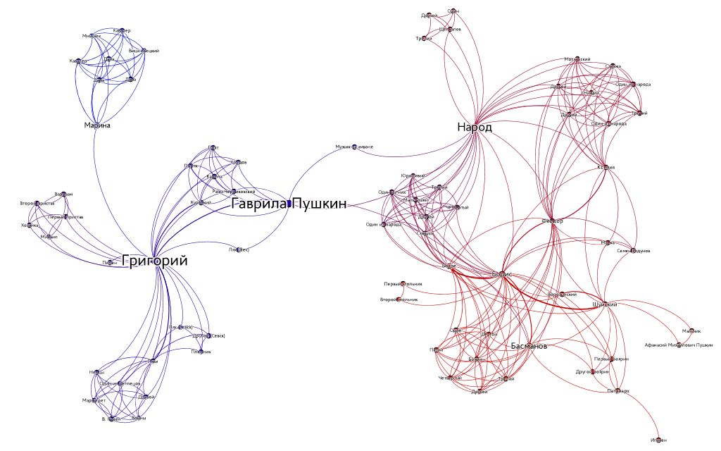 При прочтении легко не заметить важность этого персонажа, однако на визуализации сети пьесы хорошо видно, что Гаврила связывает два кластера — персонажей в Москве и в Польше. И действительно: он ездит между странами со своего рода дипломатическими миссиями, когда будущий Лжедмитрий и царь Борис еще пытаются решить дело миром, затем он же подговаривает лучшего воеводу Годунова — Басманова — перейти на сторону самозванца; в конце пьесы именно Гаврила Пушкин идет зачитывать первые указы нового царя народу (который в пьесе является вполне самостоятельным персонажем, имеет свои реплики и образует третий большой кластер)