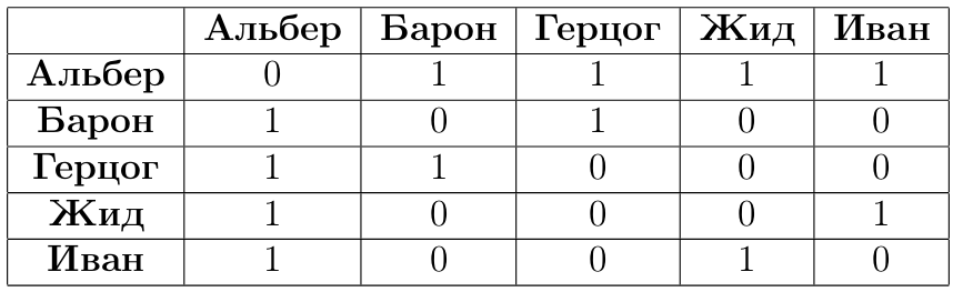 Для начала стоит рассказать о способе представления сети в виде матрицы. Такая матрица называется матрицей смежности, так как её элементы показывают, смежны ли вершины друг с другом. Например, составим матрицу смежности для уже сети уже упоминавшейся пьесы «Скупой рыцарь».