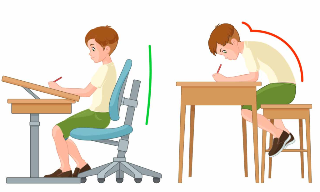 Высота стула должна быть параллельной коленным складкам. К тому же, желательно, чтобы не только стул, но и стол имел регулировку.