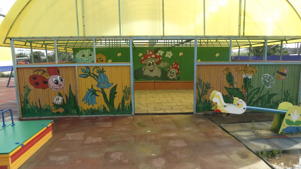 Конечно же, неотъемлемой частью жизни в садики есть обязательные прогулки на свежем воздухе. У каждой группы, есть свое закрепленное место возле садика, где детки гуляют, каждый день. На этой территории, можно увидеть не только качели, но и помещение, которое частично открыто, это веранда.