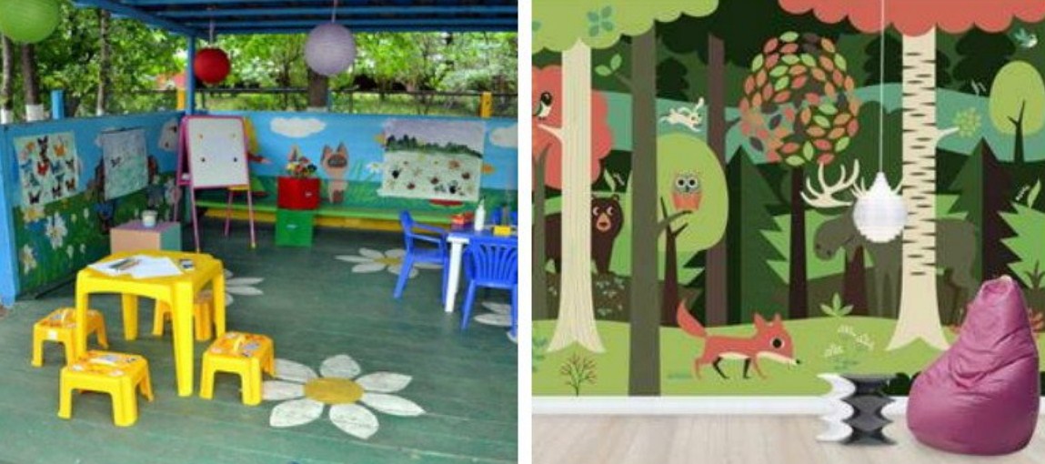 Хорошо смотрятся в детских группах фотообои с героями сказок, мультфильмов, а также наклейки с детской тематикой.