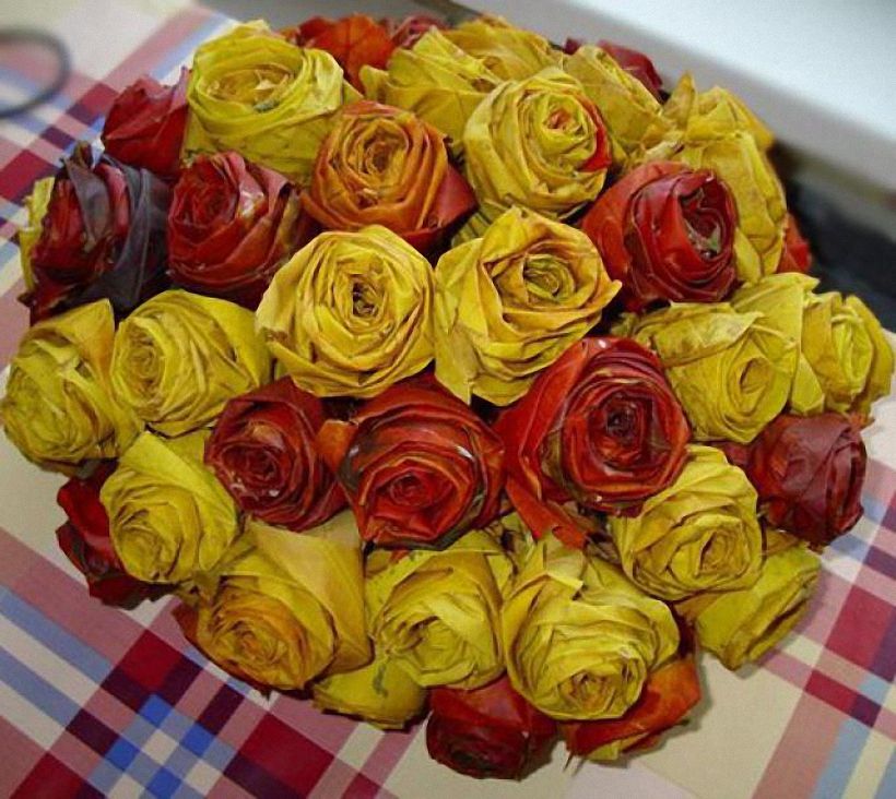 Чувство удивления вызывает букет из роз, который сделан из кленовых листьев. Техника создания бутонов роз очень проста и тем больше приводит в восторг такая необычная красивая поделка, которая будет стоять длительное время. Если научиться делать такие цветы, то их можно применять в осенних панно, в топиарии, веночках.