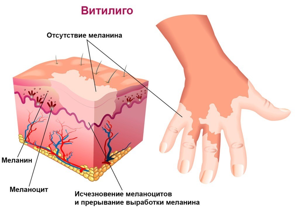 Витилиго возникает из-за того, что клетки меланоциты умирают или перестают вырабатывать меланин – пигмент, придающий цвет коже, волосам и глазам. В результате пораженные участки кожи становятся светлее или белее.