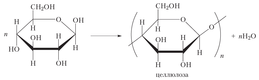 Молекулярная формула целлюлозы — (C6H10O5)n, то есть целлюлоза, как и крахмал, является полисахаридом. В то же время, строение целлюлозы и крахмала различается. В отличие от крахмала, макромолекулы целлюлозы состоят из остатков β-глюкозы. Процесс образования целлюлозы из глюкозы представлен на схеме: