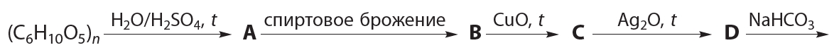 6. Природный полимер А входит в состав оболочек клеток растений. Конечным продуктом гидролиза А является вещество В. При действии на В аммиачным раствором оксида серебра образуется соединение С, обладающее двойственной химической функцией. Приведите формулы веществ А, В, С и уравнения реакций.