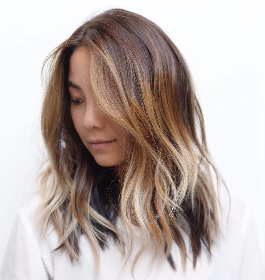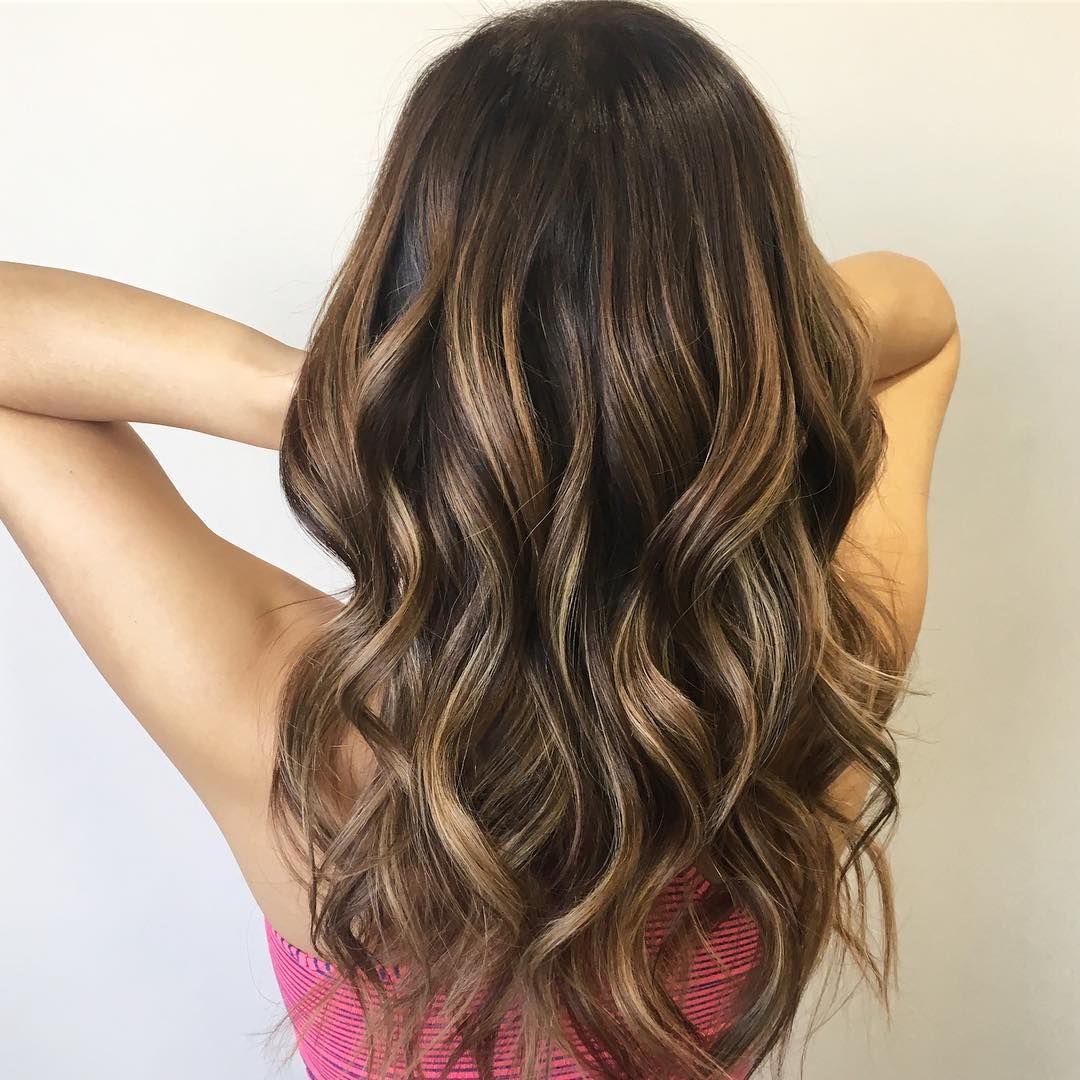 Этот вид окрашивания подходит для любого типа, структуры и длины волос. Но красивее всего балаяж на длинных волосах темных и русых оттенков. В технике используют 2-3 оттенка, близкие к натуральному тону. Переход от одного оттенка к другому должен быть плавным и незаметным. Их сочетание создает эффект выгорания на солнце и смотрится очень шикарно. Для брюнеток, которые не знают, как красиво покрасить черные волосы, это самый оптимальный вариант. Краситель наносится ∨-образно по бокам выбранной пряди и на кончики примерно на половину длины волос. Окрашивание не затрагивает корни, поэтому не нуждается в частой корректировке. Клиентки, выбравшие эту технику, могут не появляться у своего мастера по 4-6 месяцев, а некоторые даже больше. Тем самым они экономят свое драгоценное время, ну и деньги, конечно.