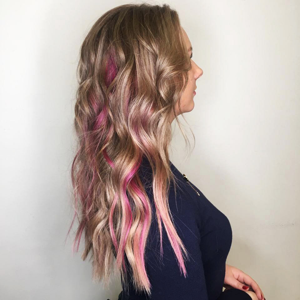Девушкам с длиной волос до плеч и ниже скрытое окрашивание предоставляет больше возможностей. Цветом можно обозначить прядки от корней до кончиков. Цветной секрет открывается, только если волосы собраны в пучок или хвост.